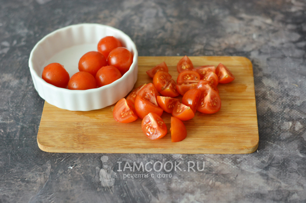 Помидоры черри также вымойте и нарежьте на половинки или четвертинки.