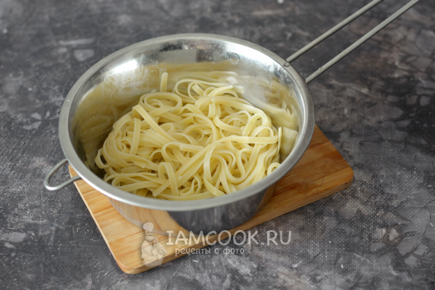 Вскипятите примерно 1 литр воды, посолите её по вкусу и в кипящую воду выложите пасту. Варите согласно инструкции на упаковке. Мне производитель рекомендовал варить лингвини 7 минут.