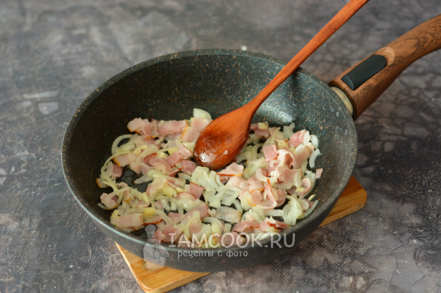 Пока варится паста, параллельно на другую конфорку поставьте сковороду. Налейте в неё масло и нагрейте на сильном огне. Слегка поджарьте бекон с луком и чесноком, около 3-5 минут, периодически помешивая.