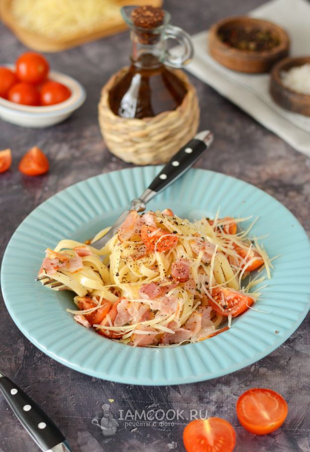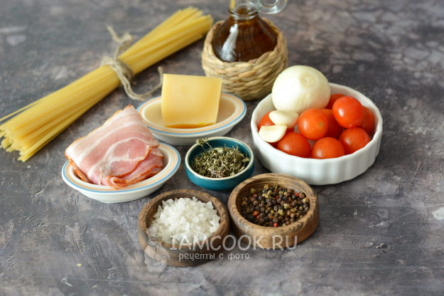 Соберите все необходимые продукты для приготовления пасты с помидорами черри и беконом.