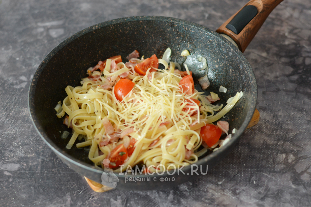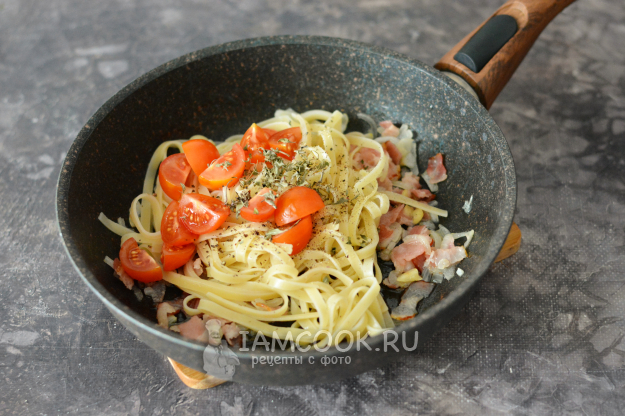 К поджаренному бекону с луком добавьте отваренную пасту лингвини, нарезанные помидоры черри и приправьте всё сушеным орегано и чёрным свежемолотым перцем.