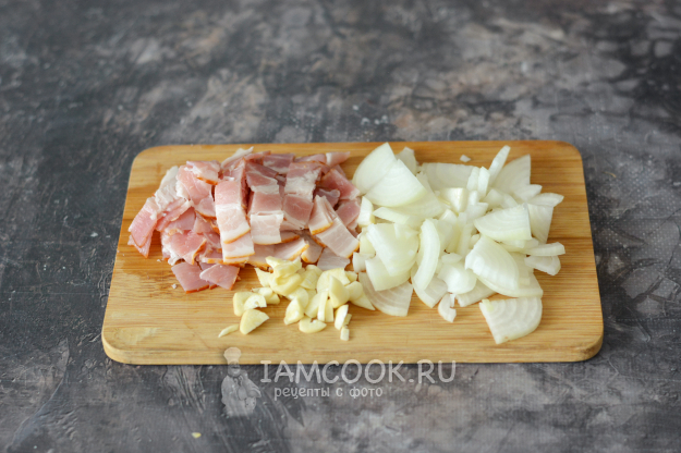 Лук и чеснок очистите. Нарежьте лук четверть-кольцами, а чеснок крупно нарубите. Бекон нарежьте широкой соломкой - около 1 см.