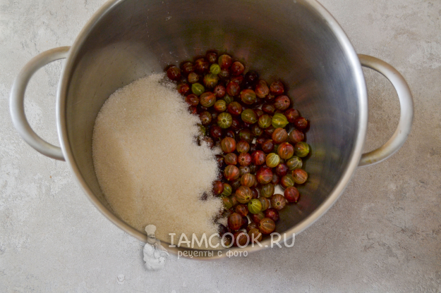 Крыжовник положите в кастрюлю, всыпьте сахар. Встряхните кастрюлю, чтобы сахар и крыжовник перемешались. Оставьте ягоды на несколько часов, можно на ночь, чтобы дали сок.