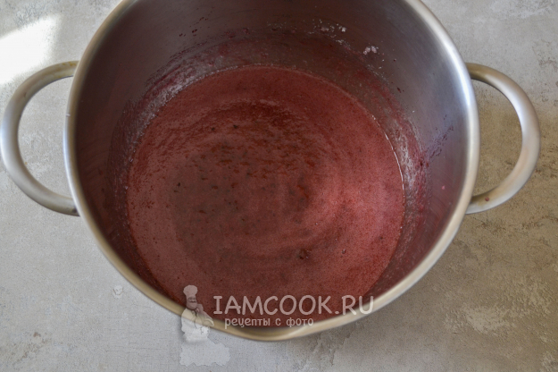 В конфитюре ягоды или фрукты должны быть равномерно распределены во всей массе, в отличие от варенья, поэтому уваренную массу можно пюрировать погружным блендером. Я пробила массу слегка, не до полного измельчения ягод.