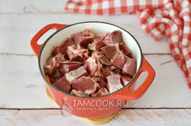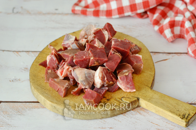 Подготовленное говяжье сердце нарежьте на куски примерно 2х2 сантиметра.
