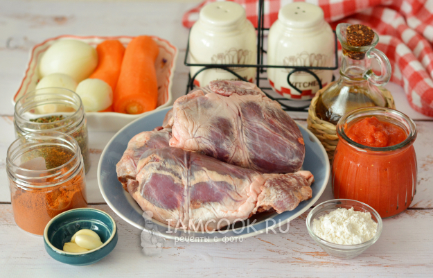 Соберите все необходимые продукты для приготовления гуляша из говяжьего сердца.