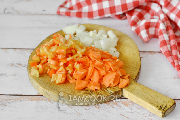 Лук, морковь и перец помойте и очистите. Нарежьте овощи кубиками или ломтиками не сильно мелко.