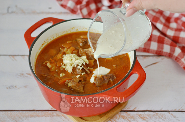 За 5 минут до готовности добавьте в гуляш натёртый на мелкой тёрке чеснок.