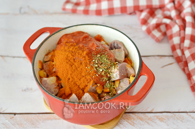Добавьте томатное пюре, паприку, соль, перец и специи на свое усмотрение.