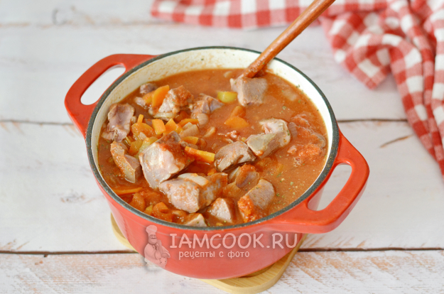 Если томатное пюре у вас кисловатое, то добавьте в гуляш немного сахара для баланса вкуса.
