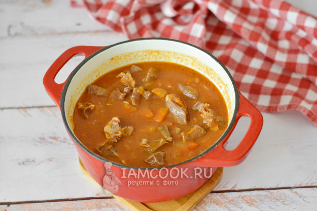 Влейте воду и доведите гуляш до кипения. Затем убавьте нагрев до самого минимума и накройте казанок крышкой. Тушите гуляш из говяжьего сердца около 2 часов, пока кусочки сердца не станут мягкими.