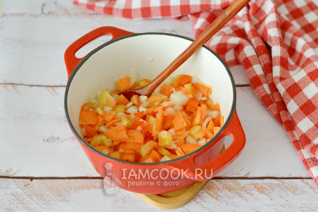 В глубокой толстостенной кастрюле или казанке разогрейте масло и обжарьте нарезанные лук, морковь и перец примерно 5-7 минут, периодически помешивая.