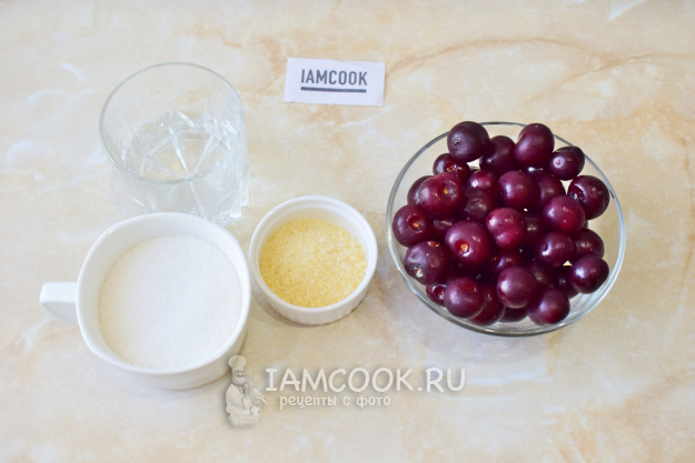 Чтобы приготовить конфитюр из вишни с желатином на зиму, соберите необходимые ингредиенты по списку. Желатин заранее залейте холодной водой и оставьте, чтобы он набух. Вишню выбирайте спелую и сочную.
