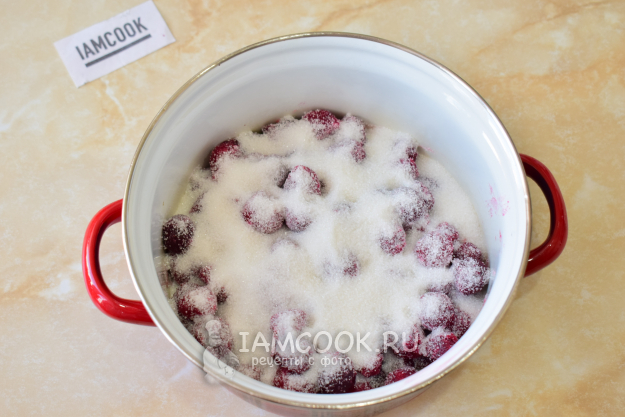 Ягоды без косточек выложите в кастрюлю и засыпьте сахаром. Оставьте постоять на 2-3 часа, чтобы ягоды пустили сок.