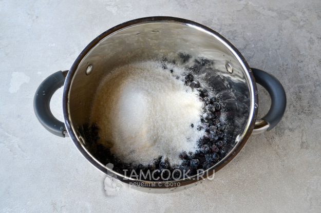 Переложите смородину в кастрюлю, всыпьте сахар.