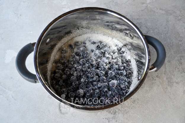 Кастрюлю встряхните, чтобы ягоды перемешались с сахаром. Оставьте на несколько часов, чтобы смородина дала сок.