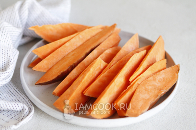 Батат хорошо промыть, кожуру я не снимаю, и нарезать, как показано на фотографии.