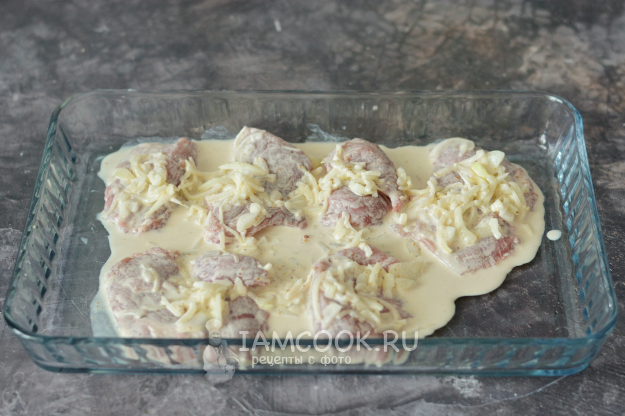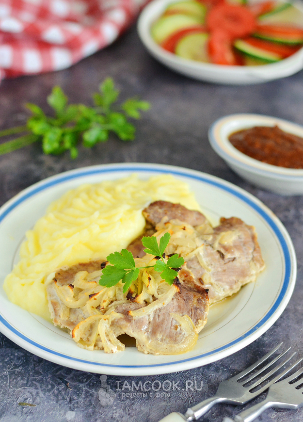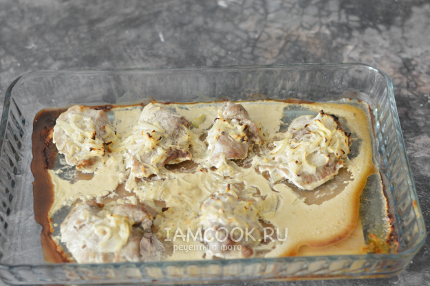 Выложите куски свинины на противень, сверху на каждый кусок распределите лук и вылейте весь маринад в противень с мясом.
