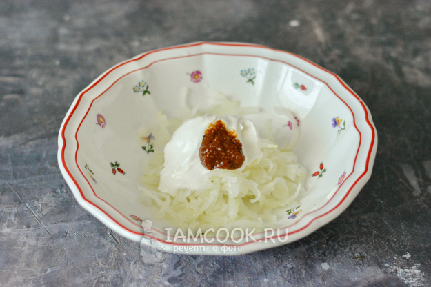 Затем добавьте к луку сметану и аджику.