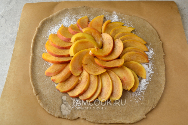 Разложите на тесто нарезанные персики, не доходя до края 3-4 см.