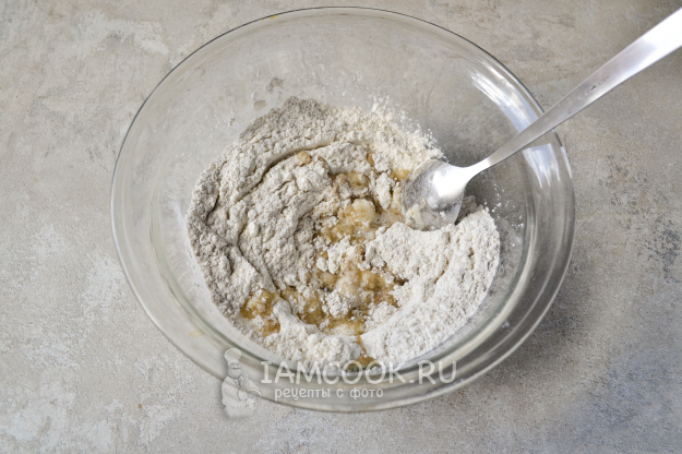 Влейте масло с водой в миску с мукой. Перемешайте муку ложкой.