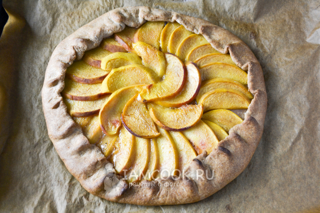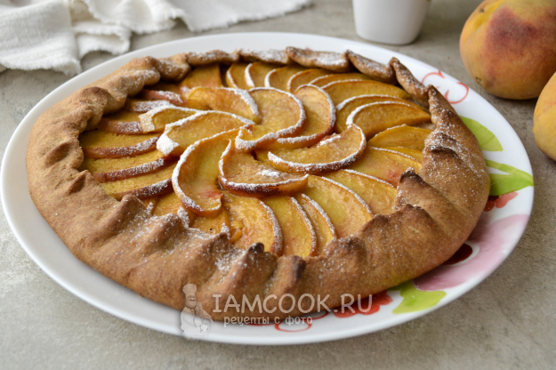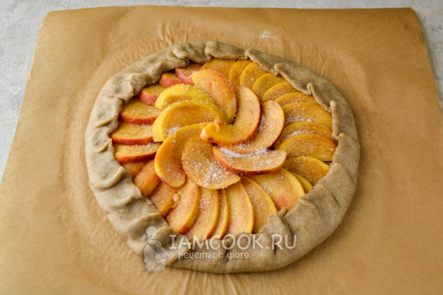 Защипните тесто складочками. Слегка присыпьте персики сахаром. Поставьте противень в разогретую до 180°С духовку.