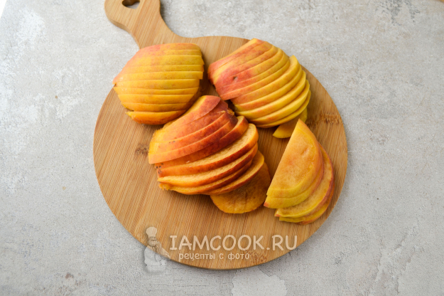 Персики вымойте, обсушите, разрежьте пополам, удалите косточки. Затем нарежьте ломтиками толщиной 5 мм.