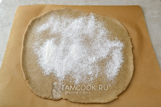 Тесто раскатайте в тонкий, 5-6 мм, пласт. Тесто удобно раскатывать сразу на пекарской бумаге или силиконовом коврике. Присыпьте тесто крахмалом. Он впитает в себя фруктовый сок при выпечке, и нижняя корочка галеты не будет мокрой.
