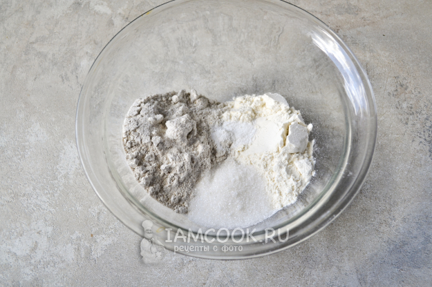 В миску насыпьте пшеничную и ржаную муку, сахар, разрыхлитель и щепотку соли. Перемешайте.