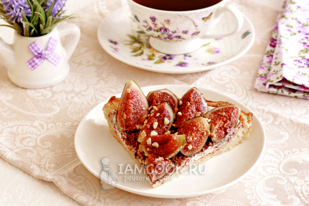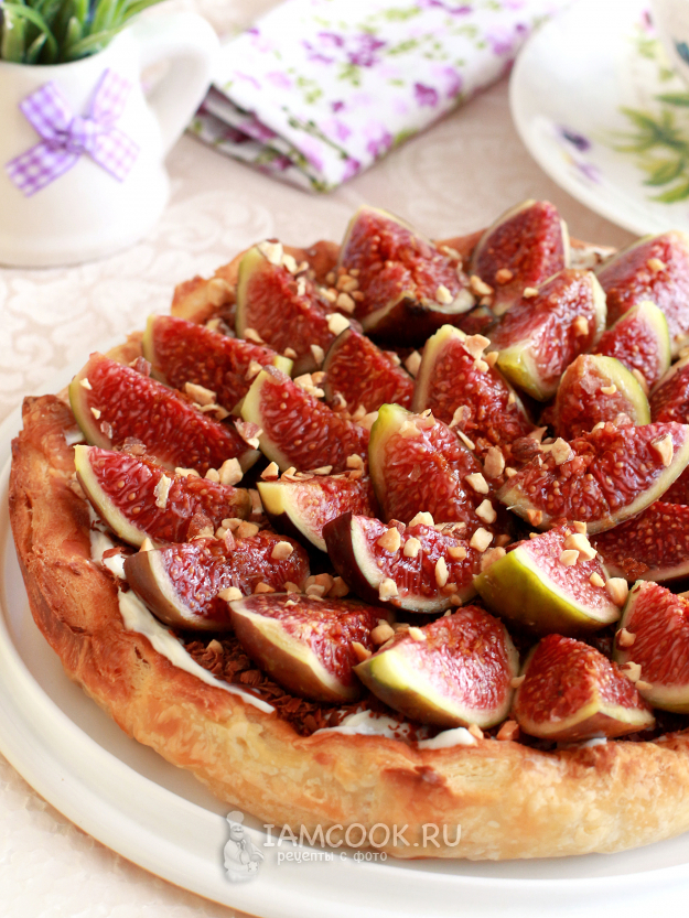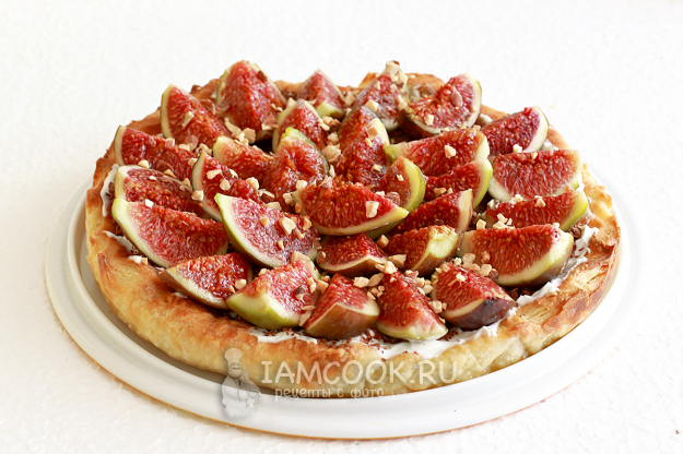Выложите четвертинки инжира и посыпьте рублеными орехами. Пирог из слоеного теста с инжиром готов!