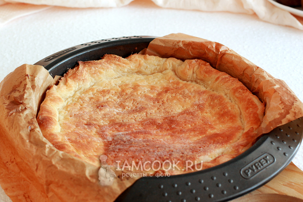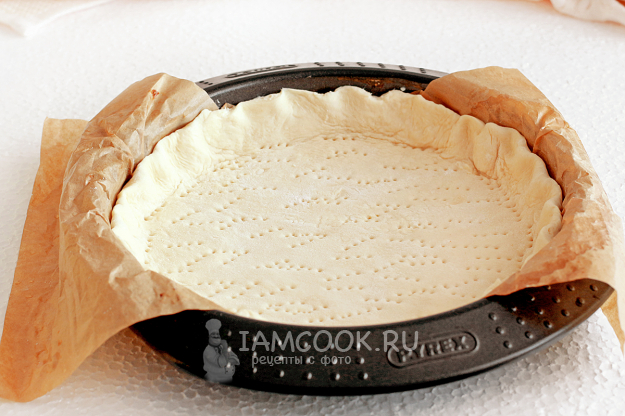 Слегка раскатайте его и распределите по форме, сделав небольшие бортики. Наколите тесто вилкой. Так как форма у меня не разъемная, я проложила её дно силиконизированным пергаментом. В этом случае достать пирог из формы можно просто за свисающие "уши" пергамента.