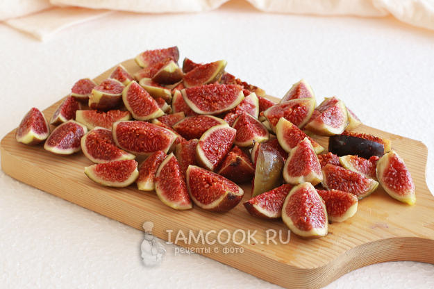 Инжир вымойте, срежьте хвостики и нарежьте на четвертинки.