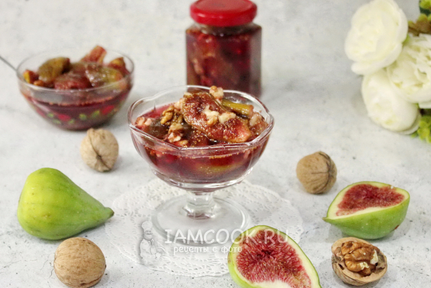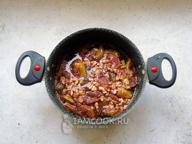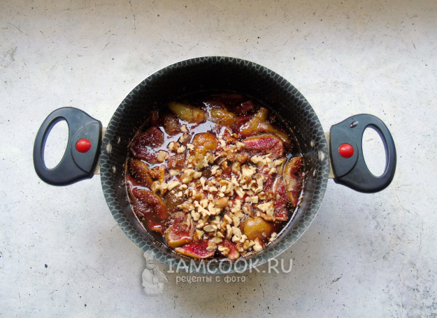 Добавьте грецкие орехи в кастрюлю с инжирным вареньем.