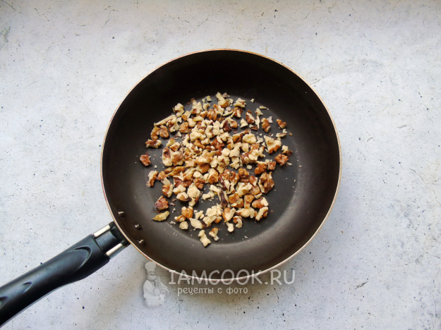 Тем временем грецкие орехи нарежьте до желаемого размера. Прокалите на сухой сковороде.