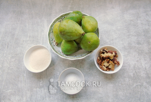 Соберите ингредиенты для приготовления варенья из инжира с грецкими орехами.