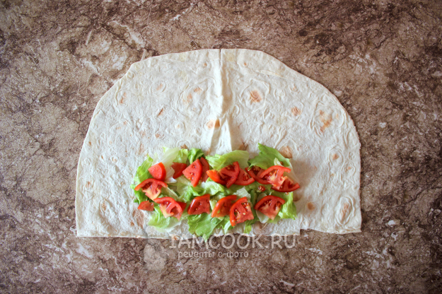 На тонкий лаваш уложите рваные кусочки листового салата и на них – ломтики свежего помидора.