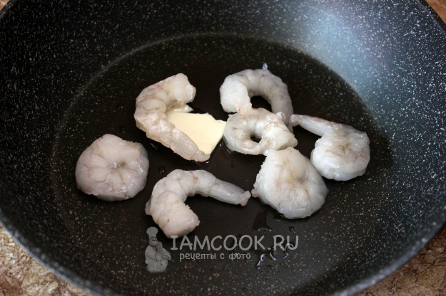 Сырые замороженные серые крупные креветки ополосните водой, чтобы убрать ледяную глазурь. Пожарьте их в течение 5 минут на среднем огне на 1 ч.л. сливочного и 0,5 ч.л. растительного масел, слегка посолите.