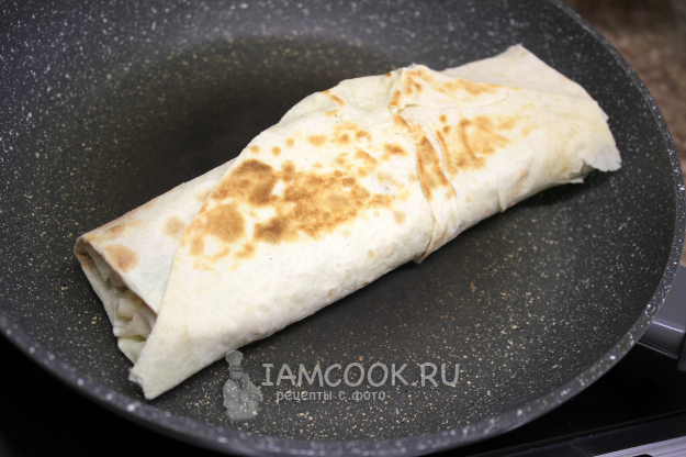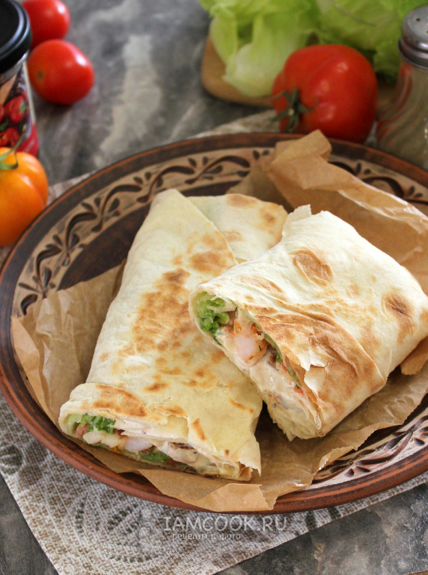 На обычной сковороде или на электрогриле обжарьте шаурму с креветками с двух сторон. Это улучшает вкус и в некоторой степени препятствует отмоканию лаваша от начинки.
