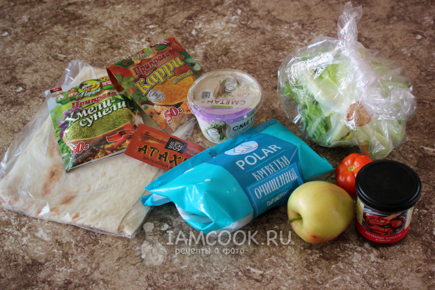 Для шаурмы с креветками подготовьте ингредиенты по списку к рецепту. Кроме салата айсберг, подходит и другой листовой. Заправку можете сделать предлагаемую, можете какую-то на свой вкус или по какому-либо рецепту с сайта. Кроме нежирной сметаны, подходит и йогурт. Арахис нужен дроблёный подсушенный или жареный.