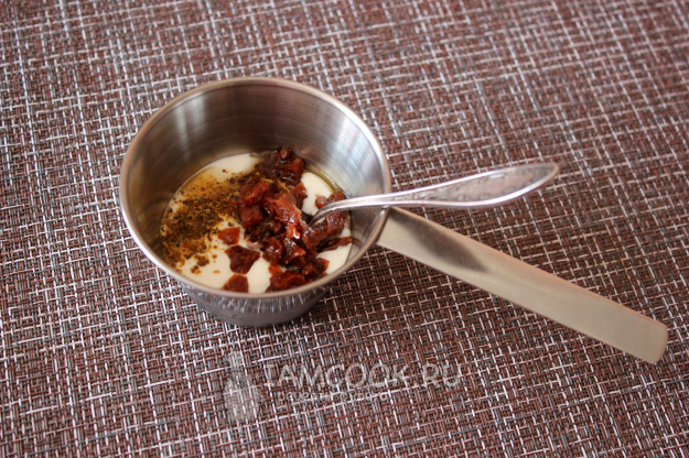 Для заправки соедините нежирную и негустую сметану с хмели-сунели (или смесью карри) и мелко нарезанным промасленным ароматным вяленым томатом. Перемешайте. Если сметана густая, то подлейте холодной питьевой воды.