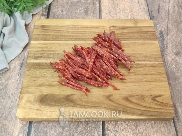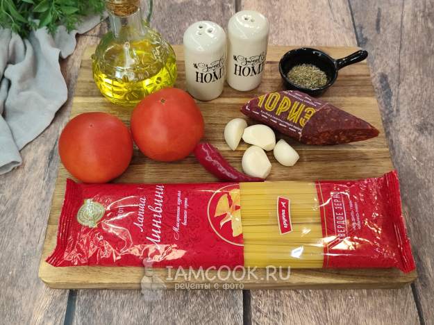 Соберите необходимые ингредиенты для приготовления пасты с чоризо. Чтобы подчеркнуть остроту колбасы, добавим чеснок и чили. А поскольку колбаска полусухая, сделаем ее немного сочнее с помощью томатов. Подойдут и консервированные, и свежие.