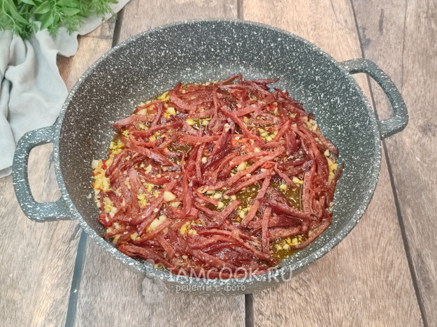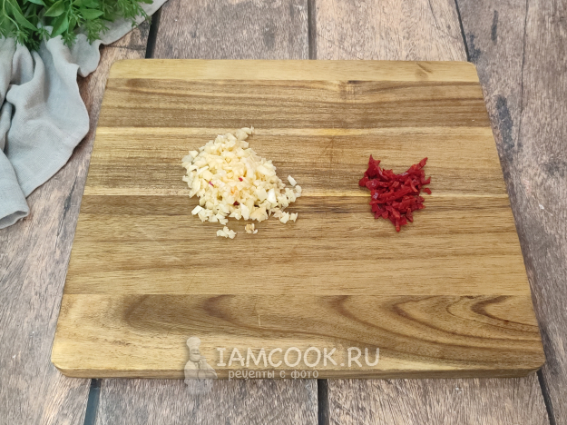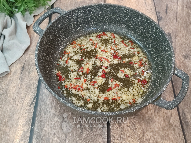 В сковороде разогрейте масло, обжарьте чили и чеснок 20-30 секунд.