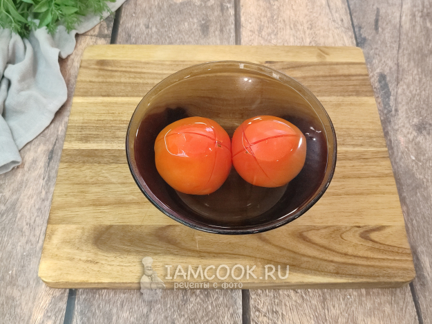 Воду для пасты уже можно ставить на огонь. А тем временем снимем с томатов кожицу любым удобным вам способом. Я обычно делаю крестообразные надрезы на томатах, заливаю кипятком на пару минут.