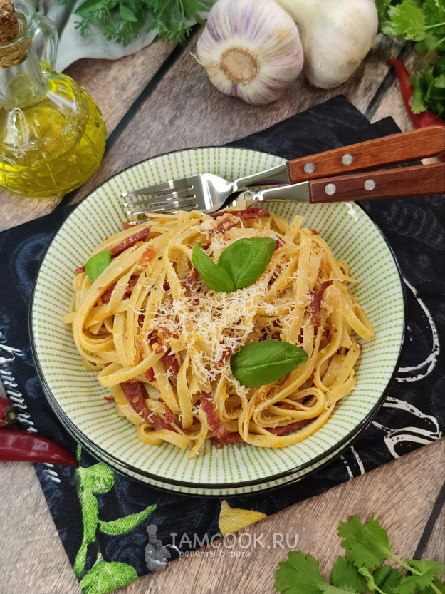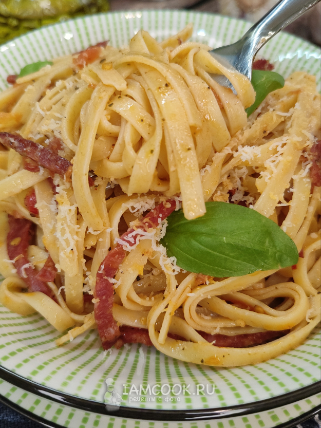 Пикантная, ароматная паста с чоризо готова! По желанию при подаче добавьте свежей зелени, сбрызните оливковым маслом, присыпьте тертым сыром)).
