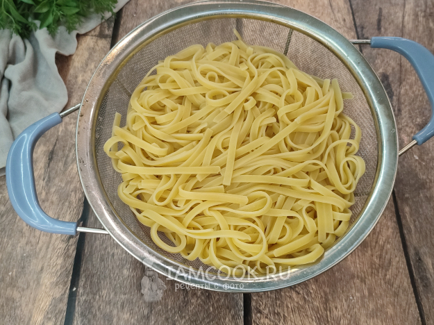 Пасту отварите согласно инструкции на упаковке. Откиньте на дуршлаг.