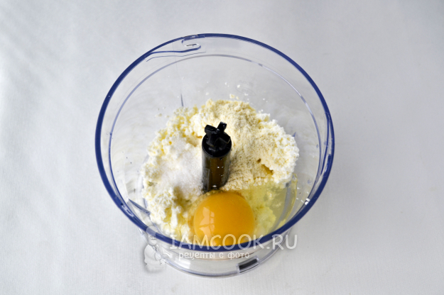 В чашу измельчителя положите творог, сахар, щепотку соли, разбейте яйцо.