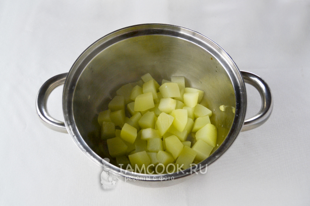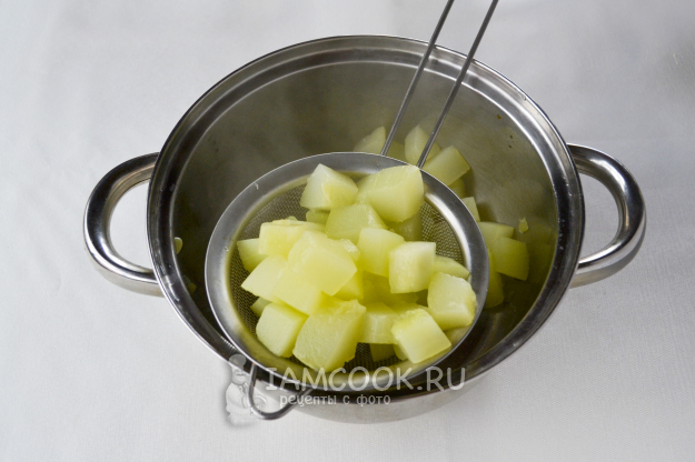 Кабачок очистите от кожуры и семечек. Нарежьте кусочками, положите в кастрюлю, влейте воду и проварите на среднем огне 5-7 минут, чтобы кусочки стали мягкими.