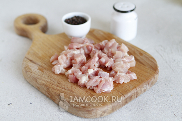 Мясо курицы промыть под проточной водой и обсушить бумажным полотенцем, затем нарезать так, как вам удобно.