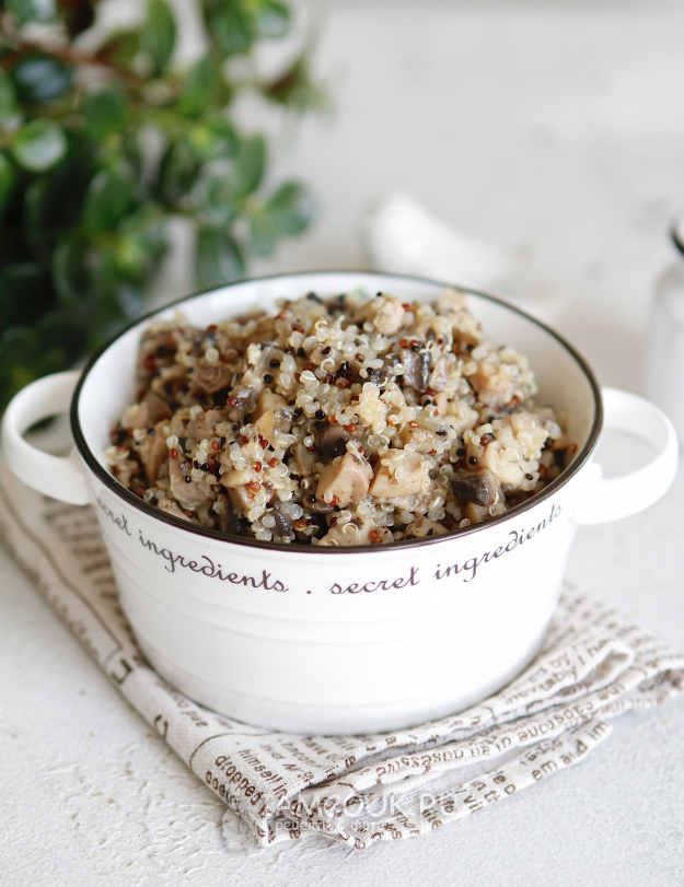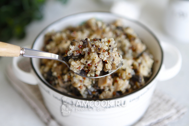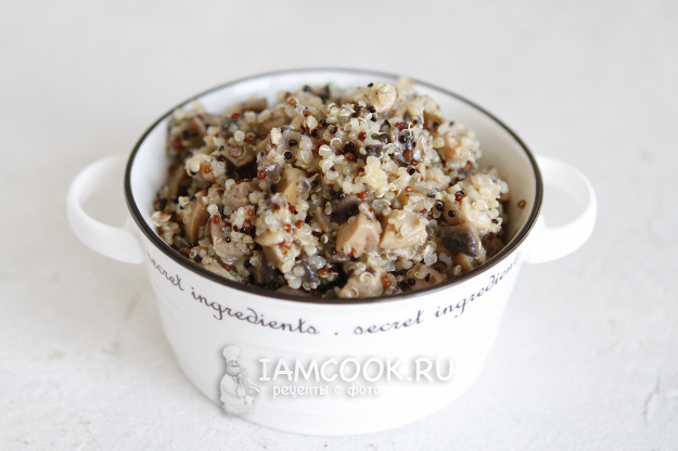 Готовое блюдо разложить по тарелкам и можно подать к столу. Киноа с курицей и грибами можно подать как полноценное блюдо и в качестве теплого салата.