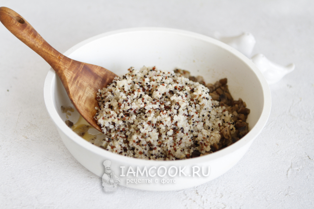 По готовности переложить киноа в сковороду. Тщательно все перемешать, прогреть еще пару минут.